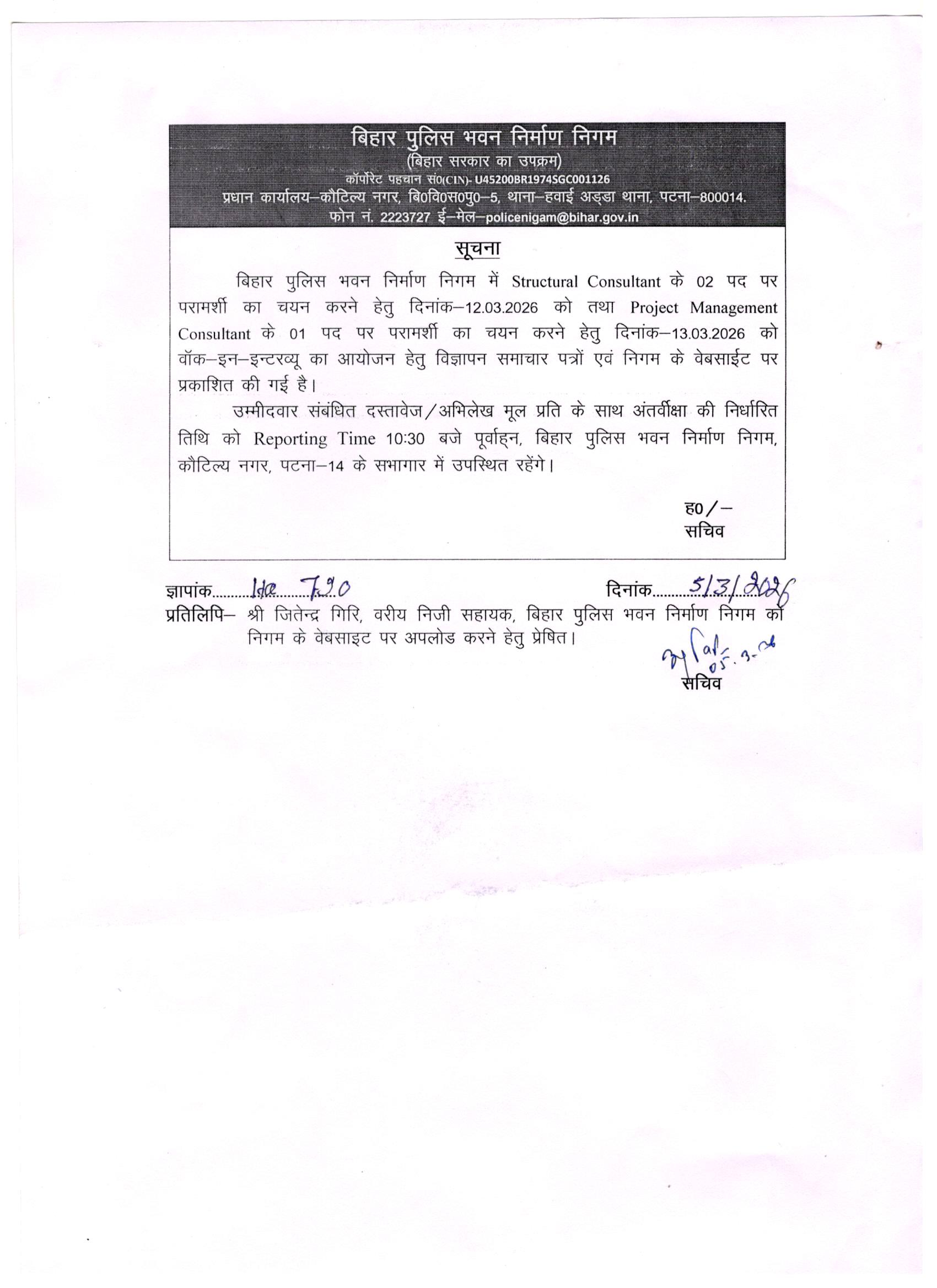 Notice regarding appointment on the post of Structural Consultant and Project Management Consultant, Bihar Police Building Construction Corporation on contract basis |